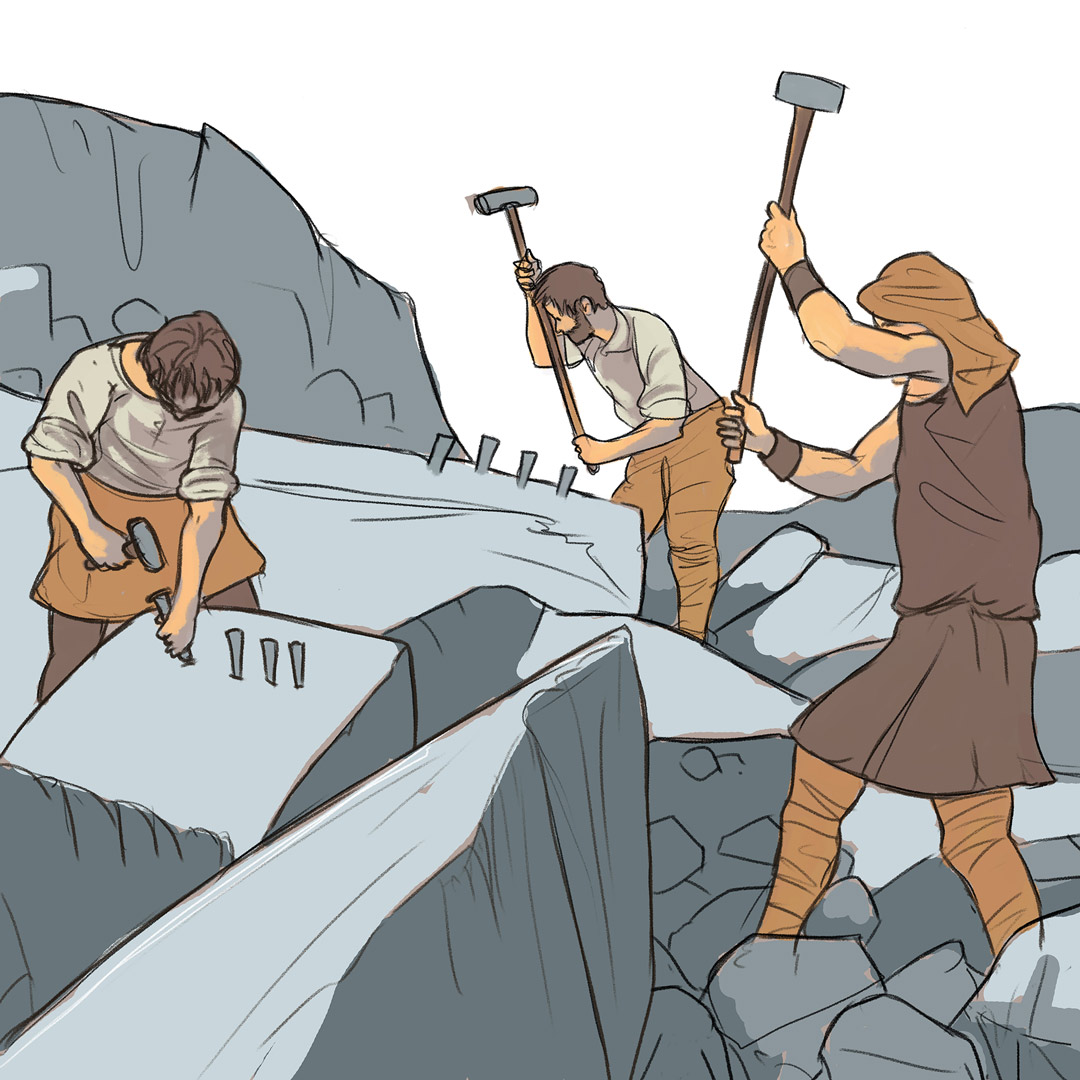 Localizado un lugar con afloramientos graníticos, los canteros comprobaban que el granito elegido no presentaba fallos o imperfecciones, para lo cual era golpeado en varios puntos diferentes con un martillo. Comprobada la viabilidad del lugar, se llevaba a cabo el corte de los bloques que luego serán tallados. Para la ejecución de esta tarea el cantero marcaba las direcciones de corte con un pico, realizando a continuación sobre esta línea una serie de huecos equidistantes en donde insertar las cuñas.