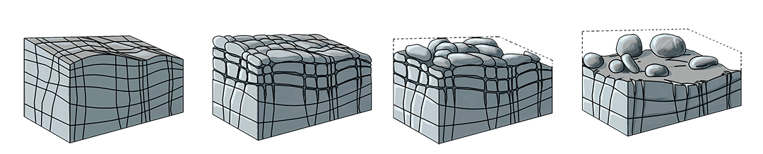 Para comprender la formación de este singular paisaje, debemos remontarnos a un pasado geológico en el que la superficie de aquel pre-Berrocal se encontraba varias decenas de metros por encima del nivel actual. Toda la masa granítica se encuentra atravesada por fracturas con dos direcciones predominantes: unas horizontales (paralelas a la superficie) y otras verticales (aproximadamente perpendiculares a las primeras); compartimentando las roca en paralelepípedos, como si de un gigantesco ‘cubo de Rubik’ se tratase. Esta red de fracturas actúa como una red de circulación de agua. El granito, aunque nos parezca una roca dura y resistente, se descompone con relativa facilidad en contacto con el agua. El resultado final de la alteración del granito es una masa arenosa, suelta y disgregada, formada por granos de cuarzo (residuales) y otros minerales parcialmente alterados, que es lo que localmente se denomina ‘jabre’.